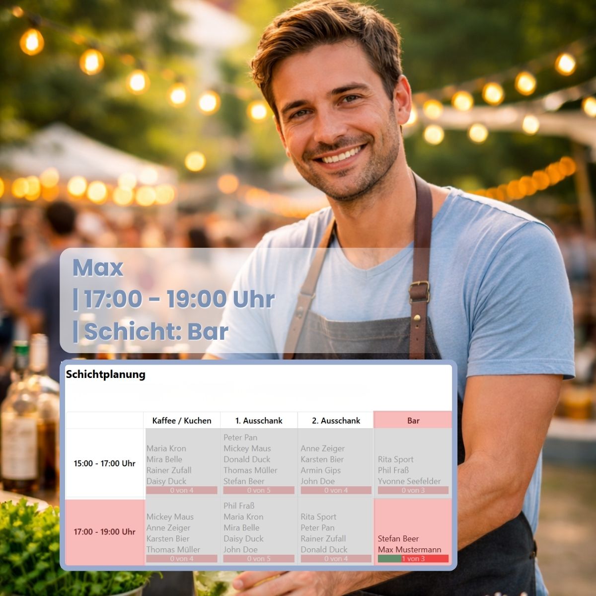 Das Tool eignet sich besonders für Vereins- oder Ehrenamtsveranstaltungen, Feuerwehraktionen, Schul- oder Fördervereinsfeste sowie kleinere Unternehmensveranstaltungen – überall dort, wo Helfer, Aufgaben und Zeitfenster zuverlässig koordiniert werden müssen. Wir haben das Tool bewusst flexibel gehalten. Es ist monatlich kündbar und kann auch nur für eine begrenzte Planungsphase genutzt werden. Für Vereine und ehrenamtliche Organisationen bieten wir zudem Sonderkonditionen an.