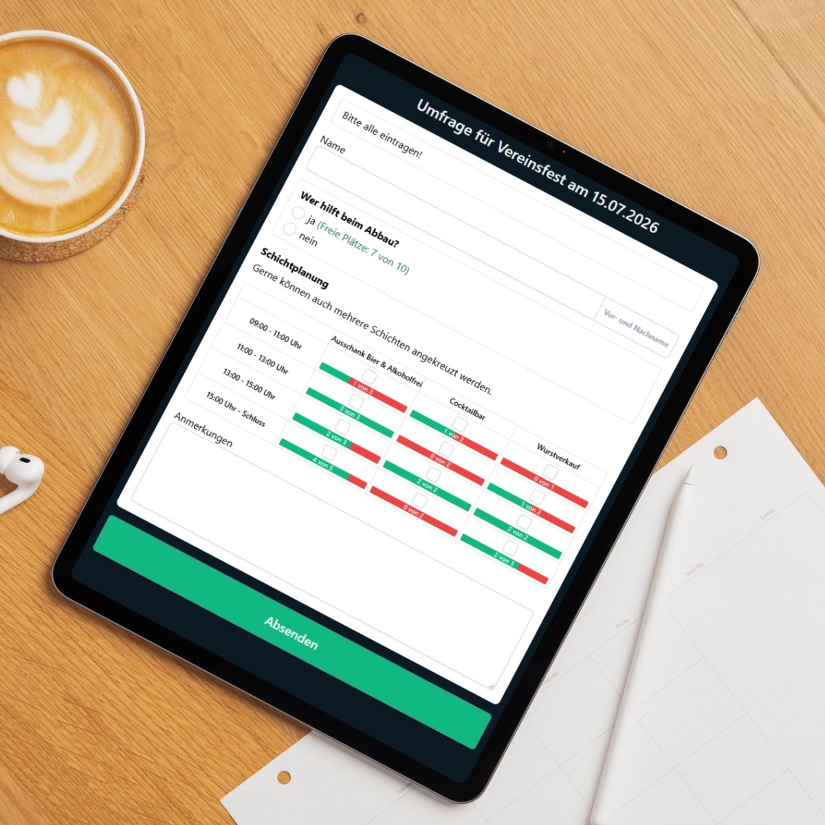 Der größte Unterschied zu klassischen Umfragen ist schnell erklärt. Bei uns stimmen Teilnehmer nicht einfach nur ab, sondern tragen sich selbst ein. In konkrete Aufgaben, feste Zeitfenster oder ganz übersichtlich in einer Tabellen- bzw. Matrixansicht. Das klingt erst einmal simpel – und genau das ist der Punkt. Jeder sieht sofort, wo noch Hilfe gebraucht wird und wo bereits genug Personen eingeteilt sind. Rückfragen werden weniger, Abstimmungen klarer, die Planung greifbarer.
